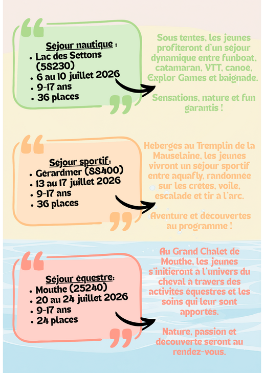 Cinq séjours sont proposés cette année pour vos enfants et jeunes âgés de 6 à 17 ans. De quoi passer un été plein d'aventures, de rencontres et de découvertes !