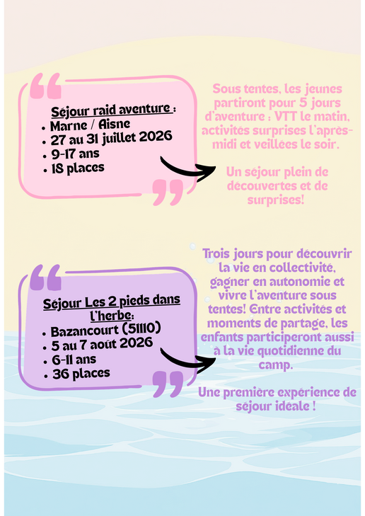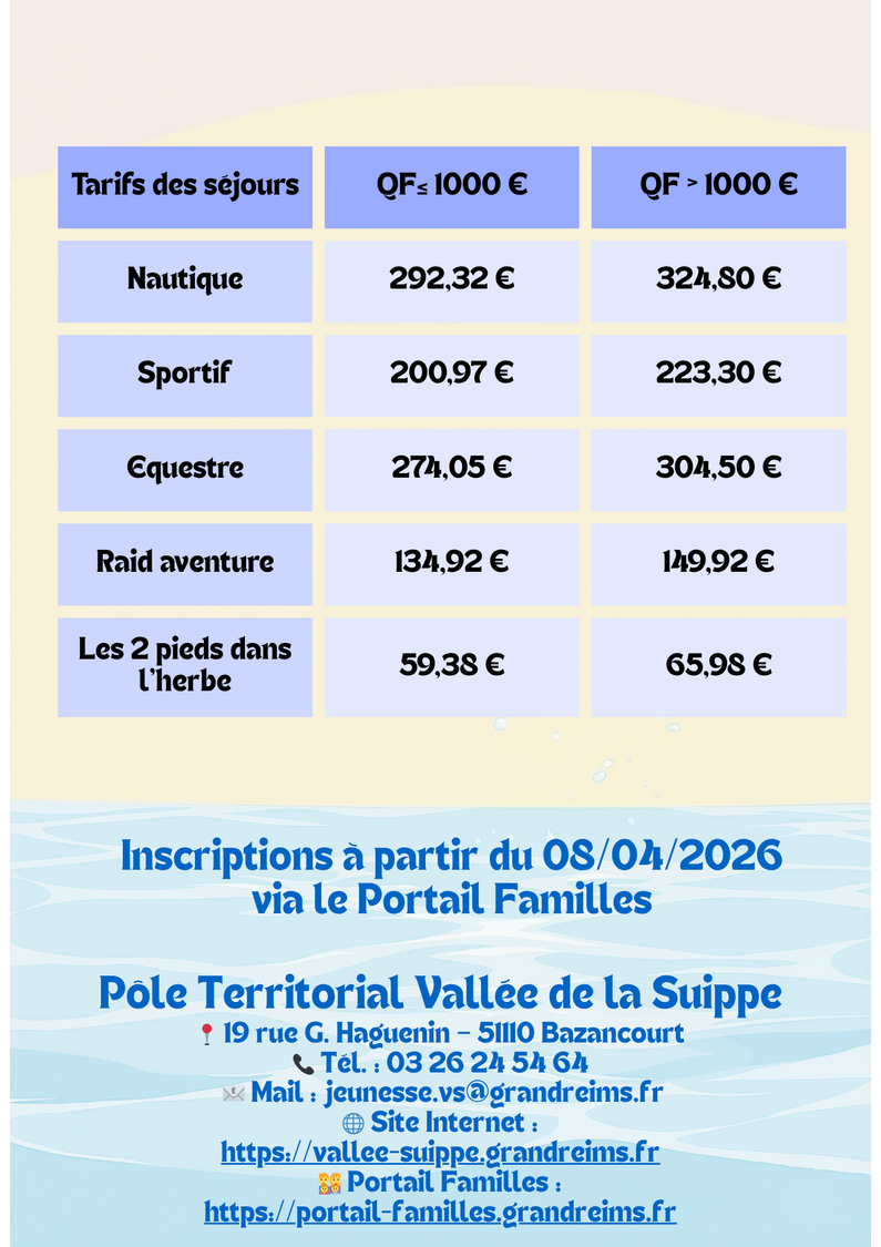 Les inscriptions ouvrent le mercredi 8 avril 2026 à 7h30 via le Portail Familles pour les habitants du Pôle Vallée de la Suippe (à partir du 22 avril 2026 pour tous), dans la limite des places disponible (il n’y a pas de liste d'attente) :